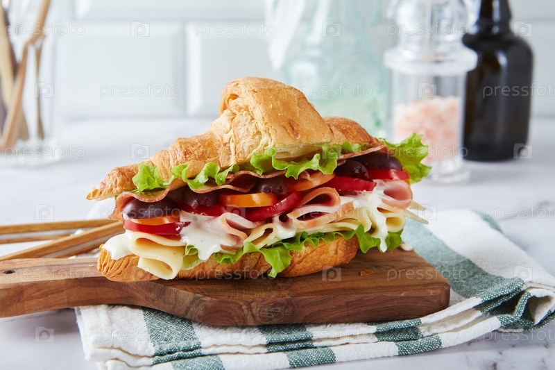 Сэндвич с кроассантом с сыром, ветчиной, салатами, помидорами, оливками и вкусным соусом на деревянном доске