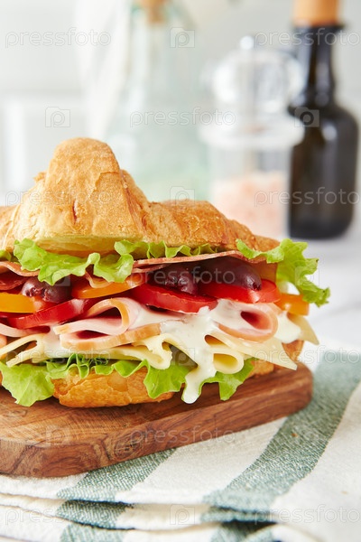 Сэндвич с кроассантом с сыром, ветчиной, салатами, помидорами, оливками и вкусным соусом на деревянном доске