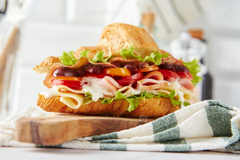 Сэндвич с кроассантом с сыром, ветчиной, салатами, помидорами, оливками и вкусным соусом на деревянном доске