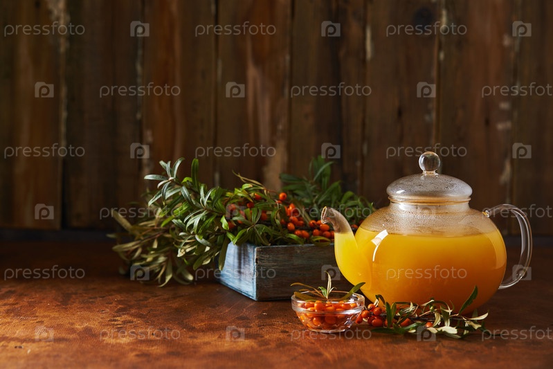 Стеклянный чайник и чашка с морским терном на деревянном фоне.Уютная осенняя композиция