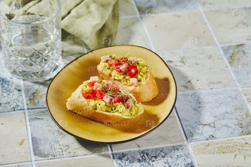Кростини или брушетта с смягченным авокадо, ветчиной и помидорами. Тост с пюре авокадо
