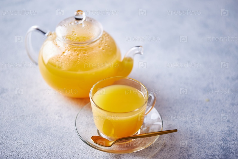 Стеклянный чайник с морским гречневым чаем на светлом фоне