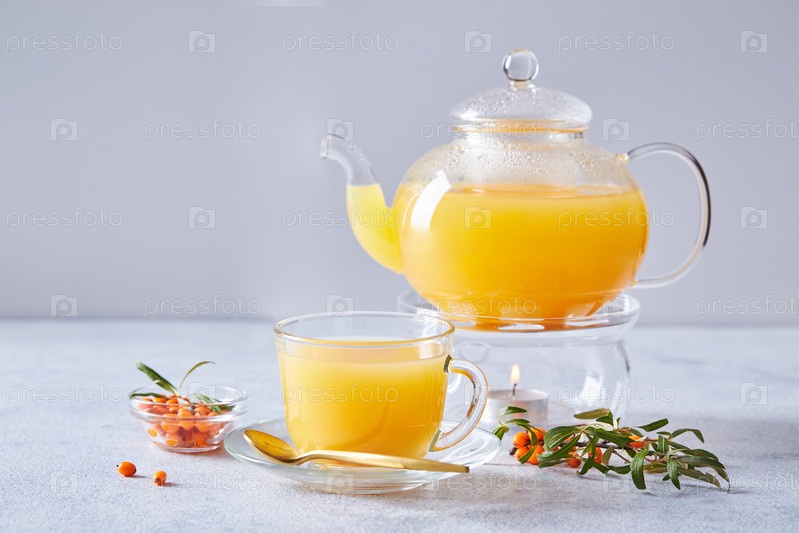 Стеклянный чайник с морским гречневым чаем на светлом фоне