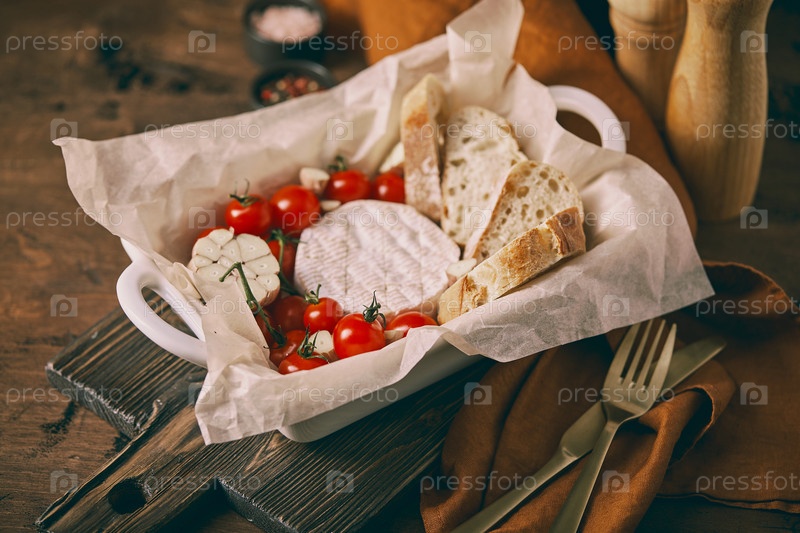 Сыр "Камемберт", испеченный с вишневыми помидорами, чесноком и багетом
