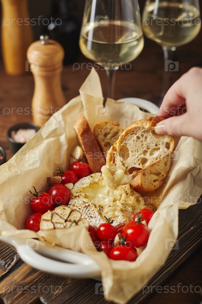 Сыр Камембер, выпеченный с вишневыми помидорами, чесноком и багеттом