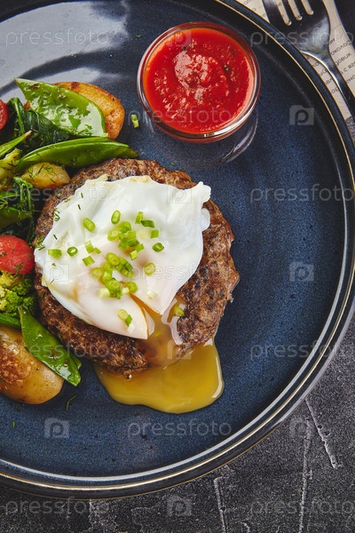 Бифштекс из фаршированной говядины с яичницей и овощным гарниром с томатным соусом на тарелке