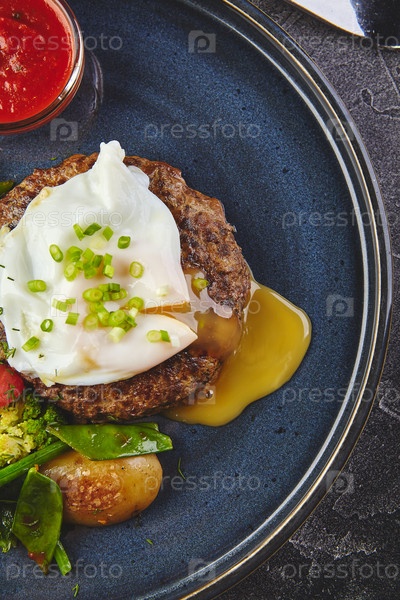 Бифштекс из фаршированной говядины с яичницей и овощным гарниром с томатным соусом на тарелке