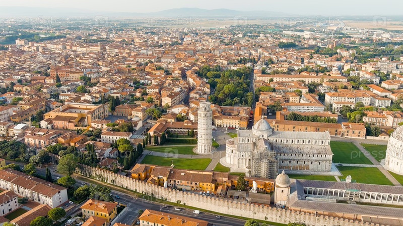 Пиза, Италия. Знаменитая наклонная башня и пизанский собор в Пьяцце деи Мираколи. Лето. Утренние часы, взгляд с воздуха