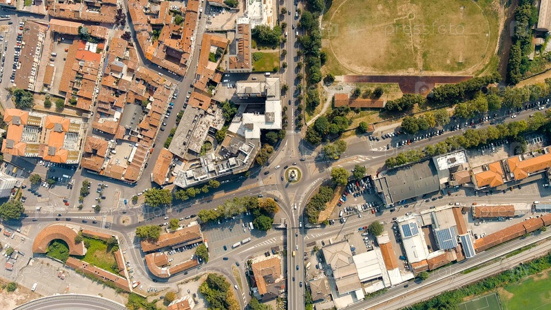 Пьяценца, Италия.Пяццале Милано - городская площадь.Исторический центр города.Летний день, Aerial View
