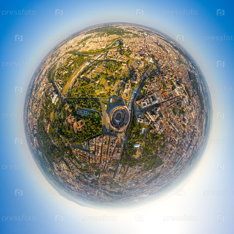 Рим, Италия. Колизей. Римский форум. Город в пределах досягаемости. Панорама города летом утром. 360-градусный панорамный астероид с воздуха