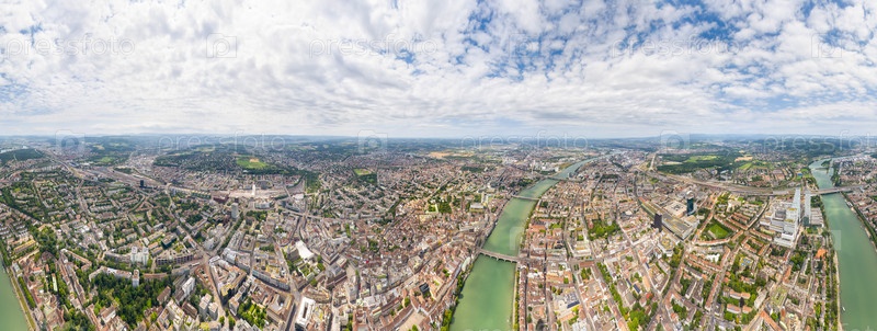 Базель, Швейцария. Панорама города. Река Рейн. Летний день. Панорама 360. Вид с воздуха
