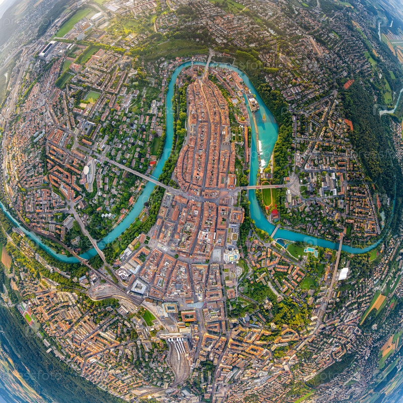 Берн, Швейцария.Панорама города в пасмурную погоду.Солнечные лучи.Летнее утро.Вид с воздуха