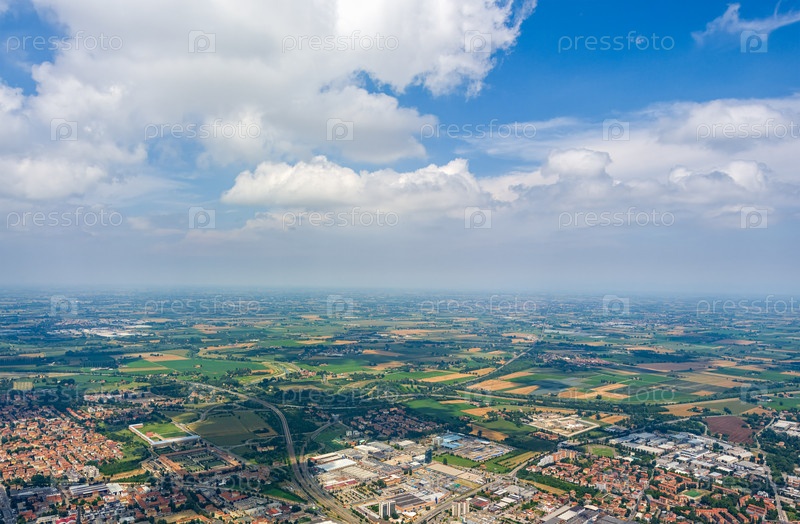 Модена, Италия Индустриальная зона и сельскохозяйственные поля Панорама города в летний день Солнечная погода с облаками Вид с воздуха