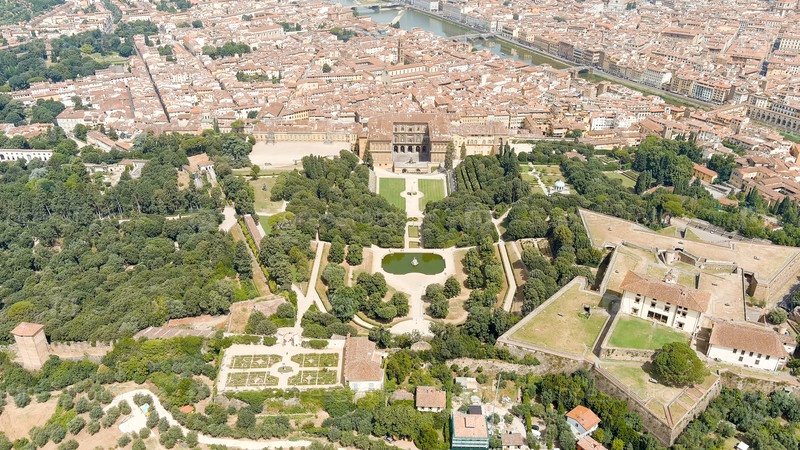 Флоренция, Италия. Палаццо Питти - Королевский дворец эпохи Возрождения. Сады Боболи (Giardino di Boboli) - Классический сад XVI-XVII веков. Летом вид с воздуха