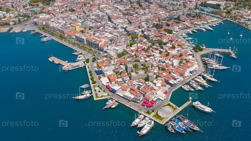 Мармарис, Турция. взгляд с воздушных дронов на прибрежную promenade с Marmaris Castle, базар и марина в солнечный летний день. старый город и средиземноморское побережье.. Aerial View