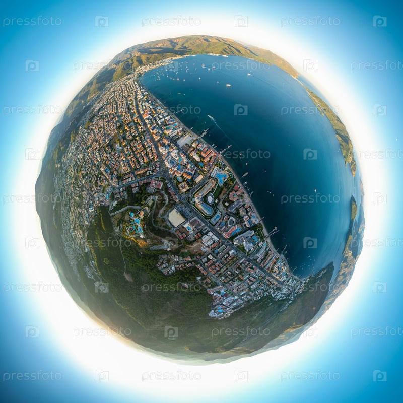 Астероид крошечная планета панорама города, гор и залива Мармарис с яхтами на закате. 360-градусный сферический взгляд из воздуха сверху