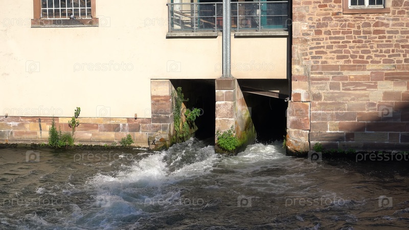 Страсбург, Франция.Распуск воды с водопадом.Маленький квартал Франции.Исторические дома на берегу реки Иль