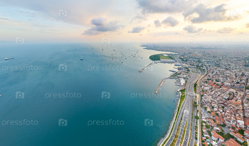 Стамбул, Турция. транзитный коридор на берегу моря. морское шествие в ожидании разрешения. туманный золотой час старого города. вид с воздуха