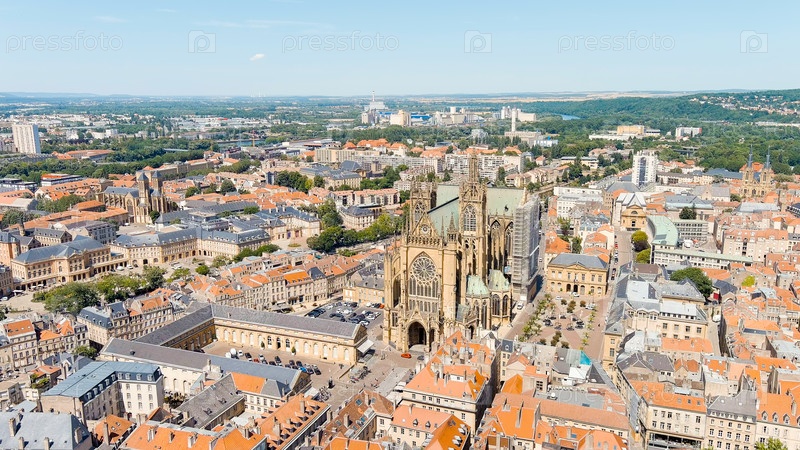 Метц, Франция. Собор Меца. Вид на исторический центр города. Лето, солнечный день, Aerial View