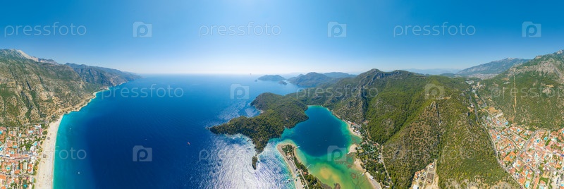 Олюдениз, Турция. цилиндрическая панорама с воздуха, показывающая прибрежный пейзаж с бирюзовыми водами, горные хребты и летний ландшафт района Олудениз. Панорама 360