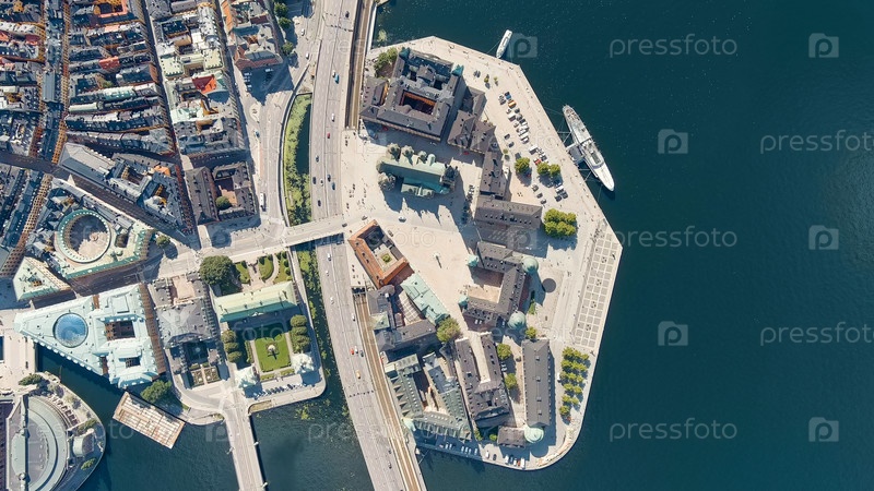 Стокгольм, Швеция. Остров Риддархольмен и озеро Маларен. Церковь Риддархольмена. Панорама города. Летний день, взгляд с воздуха