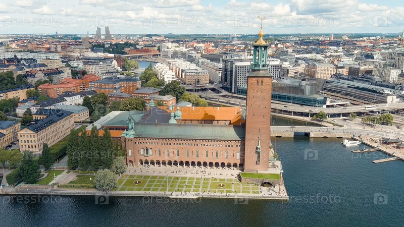 Стокгольм, Швеция. Стокгольмская ратуша и озеро Маларен. Панорама города. Летний день, Aerial View