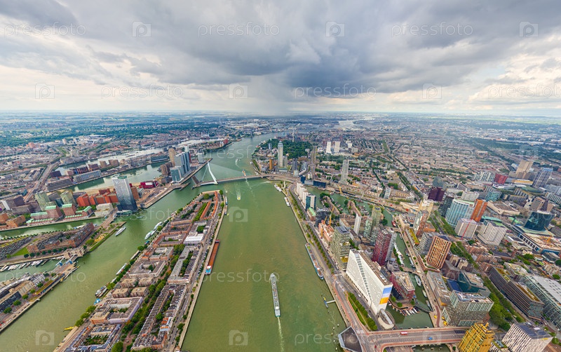 Роттердам, Нидерланды Панорама летнего города в дождливую погоду. Облака. Вид с воздуха
