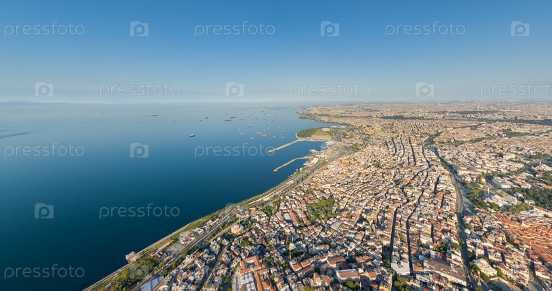 Стамбул, Турция. вид из воздуха с беспилотного летательного аппарата на Мраморное море с грузовыми кораблями, ожидающими прохода через Босфорский пролив. береговая линия района Фатих, Западный берег