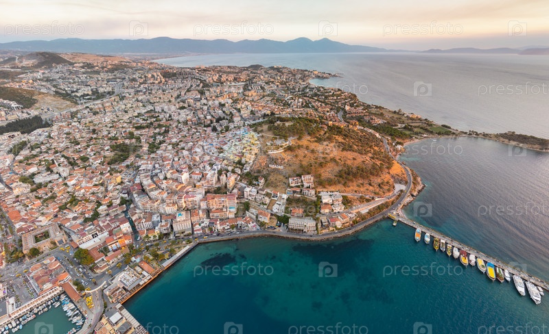 Кусадаси, Турция.Панорамный вид с воздуха сосредоточен на горе Кесе в свете заката солнца.Горная местность с знаком Кусадаси, освещенным вечерним сиянием.Вид с воздуха