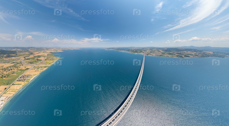 Летняя воздушная панорама Дарданелльского пролива с мостом Чанаккале 1915 года, шоссе, сельскохозяйственными полями и далекими кораблями на горизонте