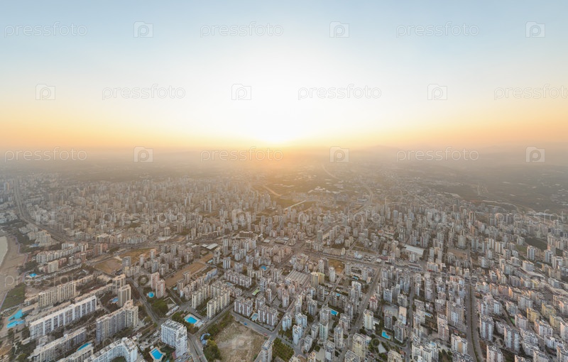Мерсин, Турция.Воздушный вид жилых кварталов Мезитли в золотое время суток.Современные многоквартирные дома, улицы и городская сетка простираются по ландшафту под теплым вечерним светом