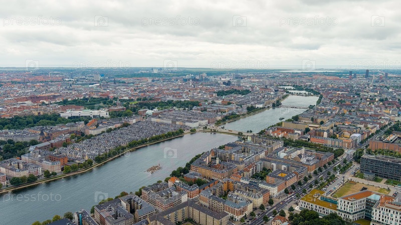 Копенгаген, Дания.Копенгагенские озера.Панорама центра города в пасмурную погоду.Летний день, Aerial View