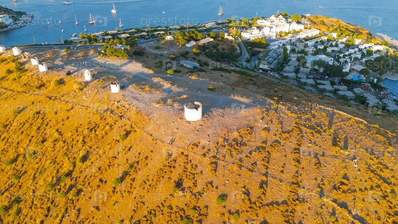 Вид с воздушного дрона на древние каменные ветряные мельницы, расположенные на зеленом склоне холма в Бодруме, Турция летом