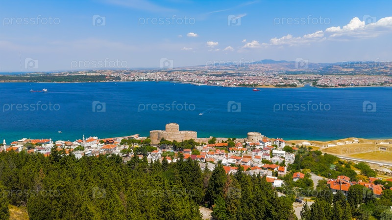 Килитбахир, Турция.Чанаккале.Килитбахерская крепость с видом на Дарданелльский пролив с городом Чанаккале видимым через воду в ясный солнечный день.Вид с воздуха