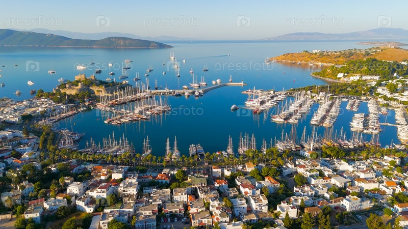 Красивый прибрежный вид с берега залива Гокова с Бодрумским замком, яхт-мариной, горами и белыми домами на переднем плане