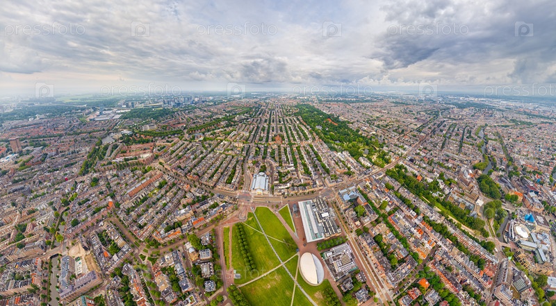 Амстердам, Нидерланды.Музеумпляйн - это парк, площадь с тремя известными музеями и парком, где проводятся фестивали.Панорама города летом утром в пасмурную погоду.Вид из воздуха