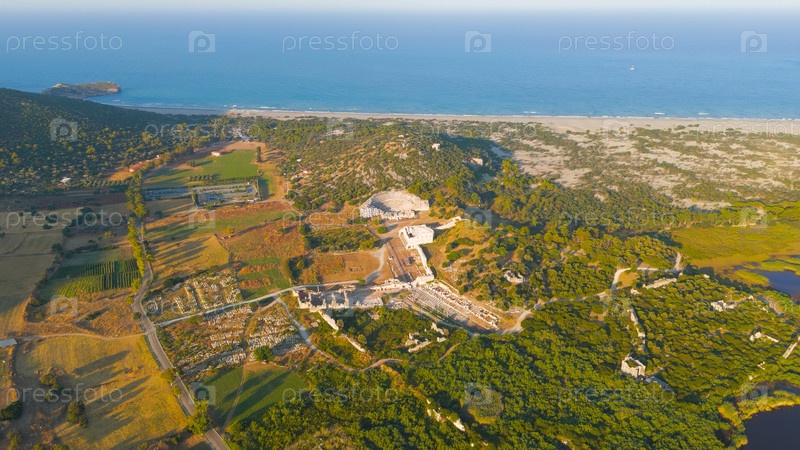 Гелемис, Турция.Утренний взгляд с воздуха на археологический памятник древнего города Патара летом, холм Тепечик, колоннированная улица, театр и пляж со Средиземным морем
