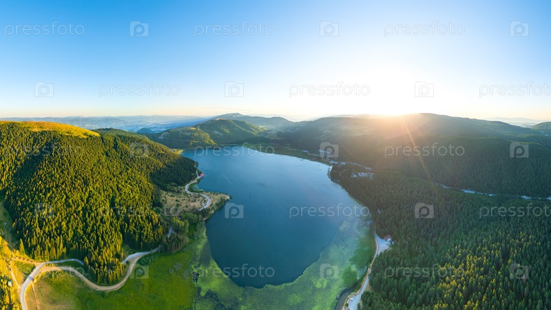 Абант - большое пресноводное озеро, окруженное горами и лесом с живописным видом. время захода солнца. летний пейзаж. вид из воздуха