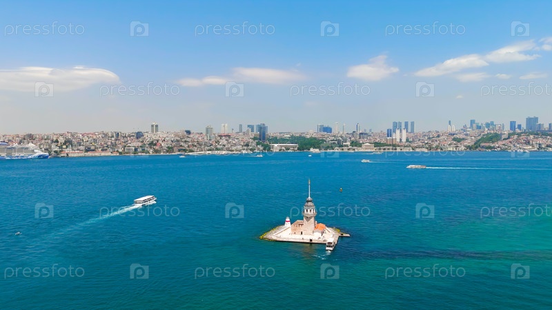 Европейский берег Босфорского пролива с пассажирскими паромами и водными такси, плавающими в ясный солнечный день
