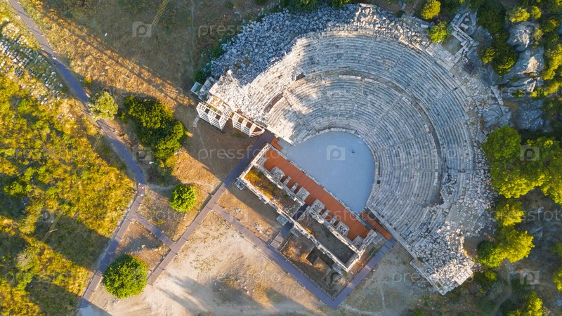 Гелемис, Турция.Взгляд сверху вниз из воздуха на Древний театр Патары, пещеру с 38 рядами и здание сцены, археологический памятник столицы Ликии