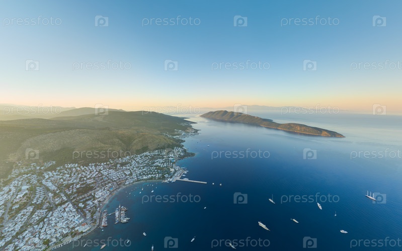 Бодрум, Турция.Высоко совместимая утренняя панорама бирюзового Эгейского моря, наполненного роскошными яхтами, парусниками и нетронутыми лесными островами под идеальным светом.Вид с воздуха