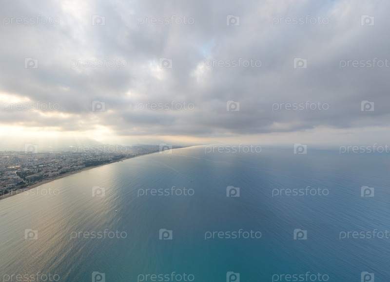 Аэрофотосъемка береговой линии пляжа Кейкубат, простирающейся до горизонта с лучами солнца, проникающими сквозь облака над Средиземным морем