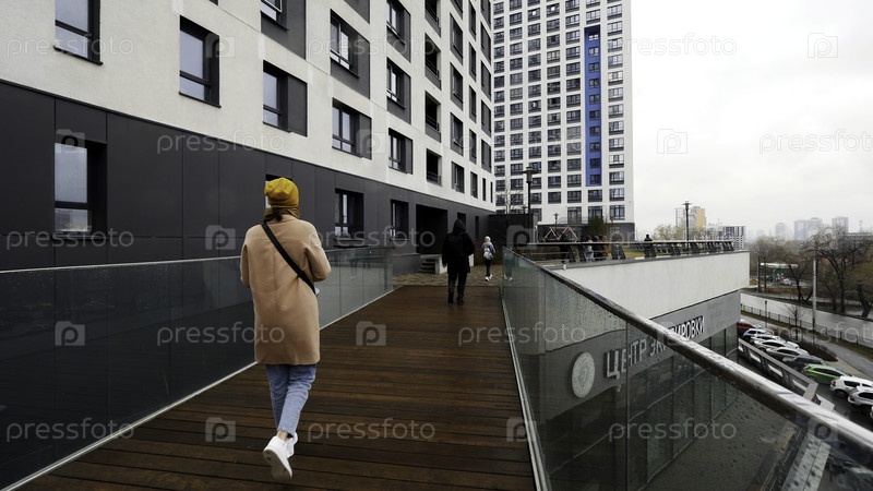 Люди, гуляющие вдоль недавно построенного многоэтажного здания осенью