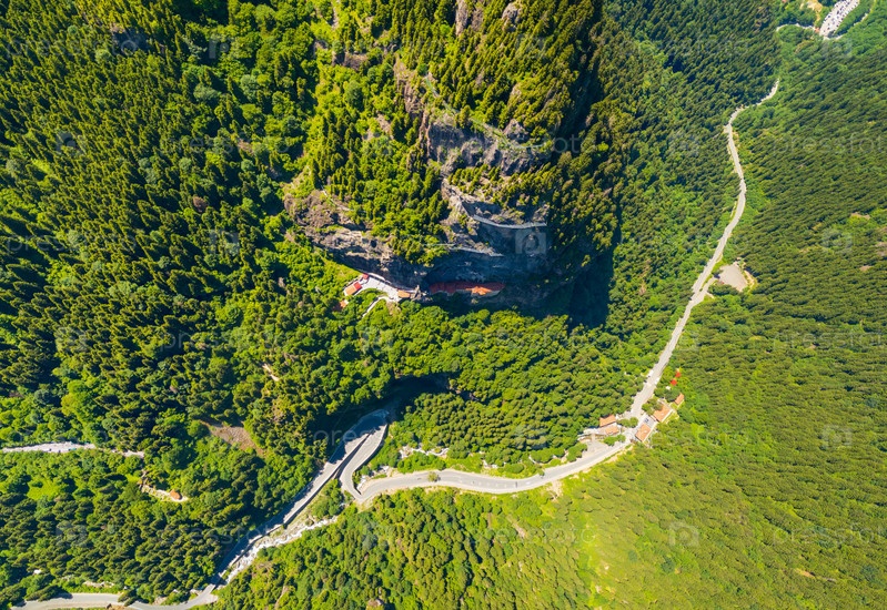 Альтиндере, провинция Трабзон, Турция. Монастырь Сумела. Парк долины Альтиндер. Панорамные виды в течение дня. Летание по долине. Изобретенный лес на склонах. Вид с воздуха