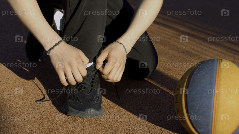 Подготовка к длительной тренировке СМИ Волейболистка, завязывающая кроссовки на поле рядом с мячом для волейбола. высокое качество 4k видео