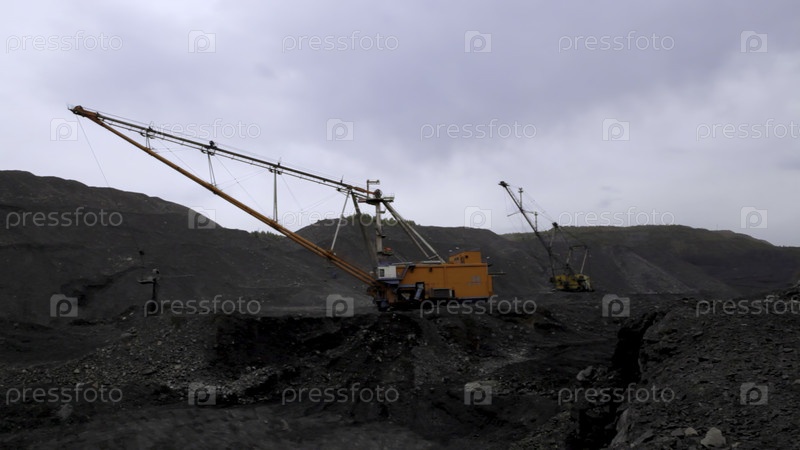 Экскаваторы активно работают на майнинговой площадке, демонстрируя мощное промышленное оборудование среди шероховатой местности