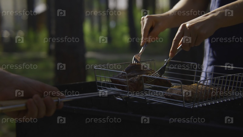 Мужчина переворачивает мясо на гриле. Скриншоты. Близкий план человека, переворачивающего куски мяса на гриле. Переворачивая мясо на гриле для жарки в солнечный летний день