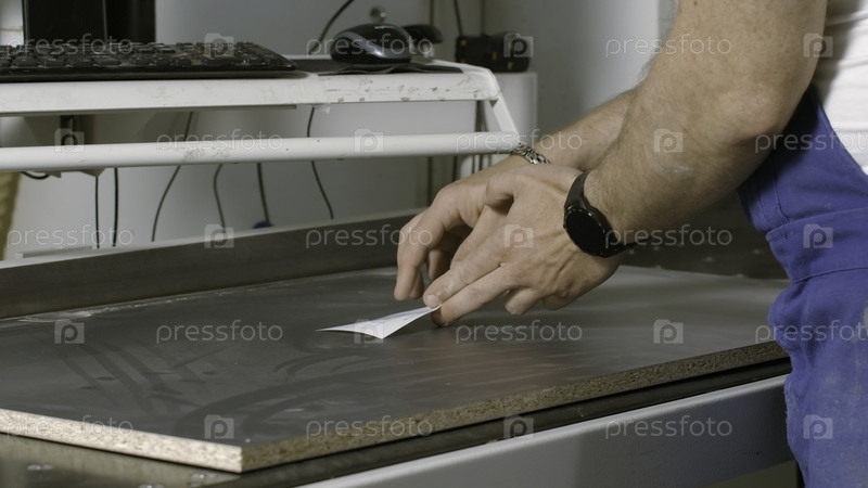 Плотник ставит бумажную наклейку на деревянную доску.Креативность.Мужчина работает с деревом, деревообработкой и традиционной плотницей