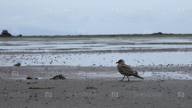 Красивая чайка на берегу моря в пасмурный день. Клип. Коричневые пятнистые чайки на песчаном пляже. Чайки ходят по берегу