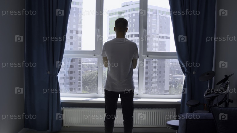 Молодой уверенный в себе мужчина, смотрящий через окно дома со скрученными руками СМИ Задний вид молодой модели